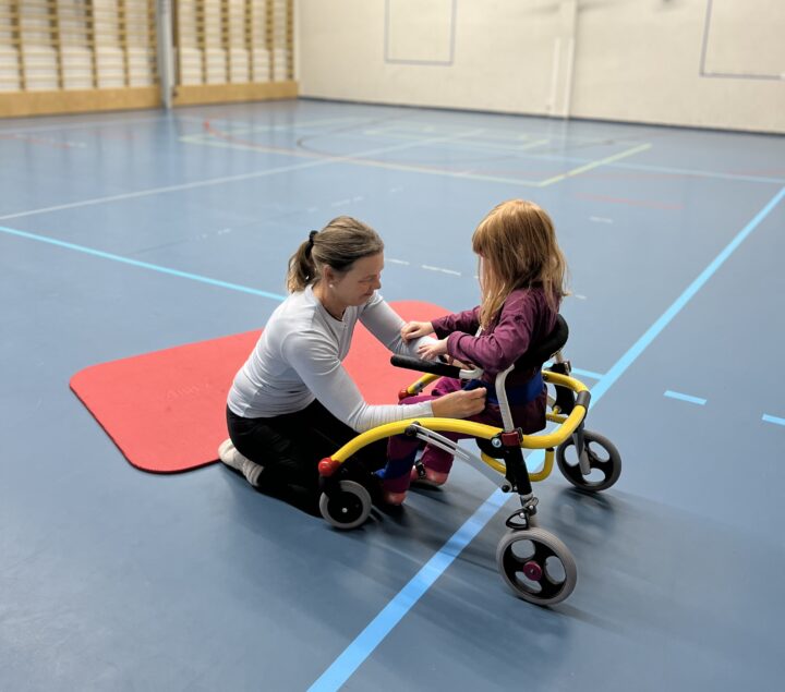 “Aloitimme heti harjoittelemaan polviseisontaa ja konttausasentoa sekä vartalon symmetriaa. Vasen alaraaja kiertyi voimakkaasti sisäänpäin, ja tiesin, että jos tämä asento jäisi pysyväksi, se vaikuttaisi myös tulevaan seisoma-asentoon ja mahdolliseen kävelyyn. Harjoittelimme keskivartalon lihasvoimaa – erityisesti pakaroita, vatsaa ja selkää – jotta seisominen ja tasapaino olisivat tulevaisuudessa mahdollisia.”