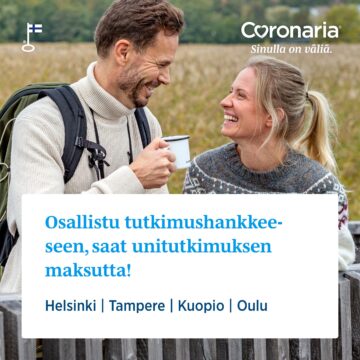 Etsimme perusterveitä 18-65-vuotiaita mukaan tutkimushankkeeseen, jossa tutkitaan yhteistyökumppanimme mittalaitteiden mittaustarkkuutta mm. unihäiriöiden tunnistamisessa. Osana tutkimusta saat laajan unitutkimuksen sekä sen jälkeisen lääkärin etävastaanottokäynnin ilmaiseksi (arvo noin 929 euroa). Tutkimukseen voi osallistua Helsingissä, Tampereella, Kuopiossa tai Oulussa. Lue lisää ja ilmoittaudu mukaan.